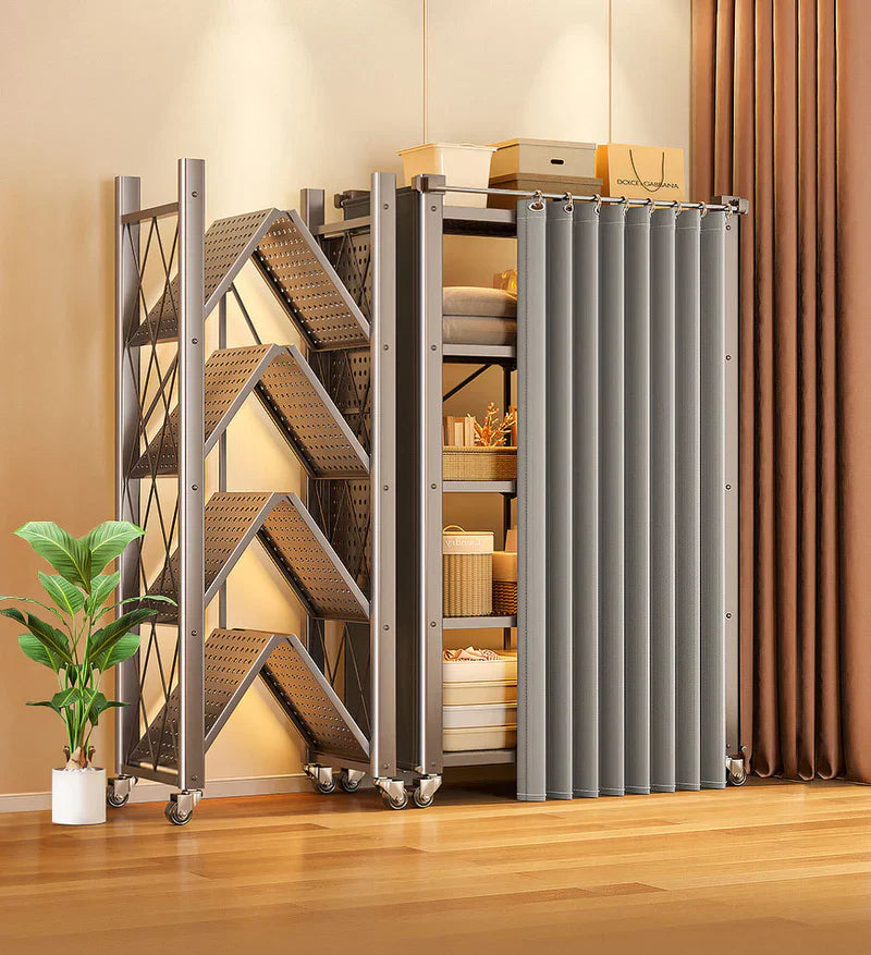 יחידת מדפים ללא התקנה: יחידת המדפים המורכבת מראש מוציאה עבורך את הטרחה מההתקנה ופורסת אותה תוך 5 שניות. עם 4 גלגלים, קל לדחוף אותו לכל מקום. עיצוב מתקפל לנשיאה ואחסון קלים.