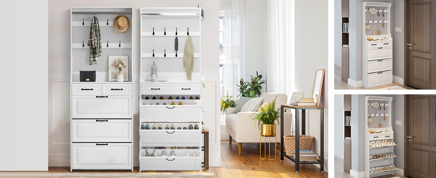 אין יותר נעליים בכל רחבי הרצפה, ארון אחסון נעליים זה לכניסה כולל 3 מגירות עמוקות מתקפלות, כל מגירה עם שתי שורות של נעליים. משמעות הדבר היא שתוכלו להחזיק עד 24 זוגות נעליים בתוכן, מה שעוזר לכם לארגן את הנעליים שלכם ולחסוך מקום בו זמנית. ולקבל כניסה מסודרת ומאורגנת.