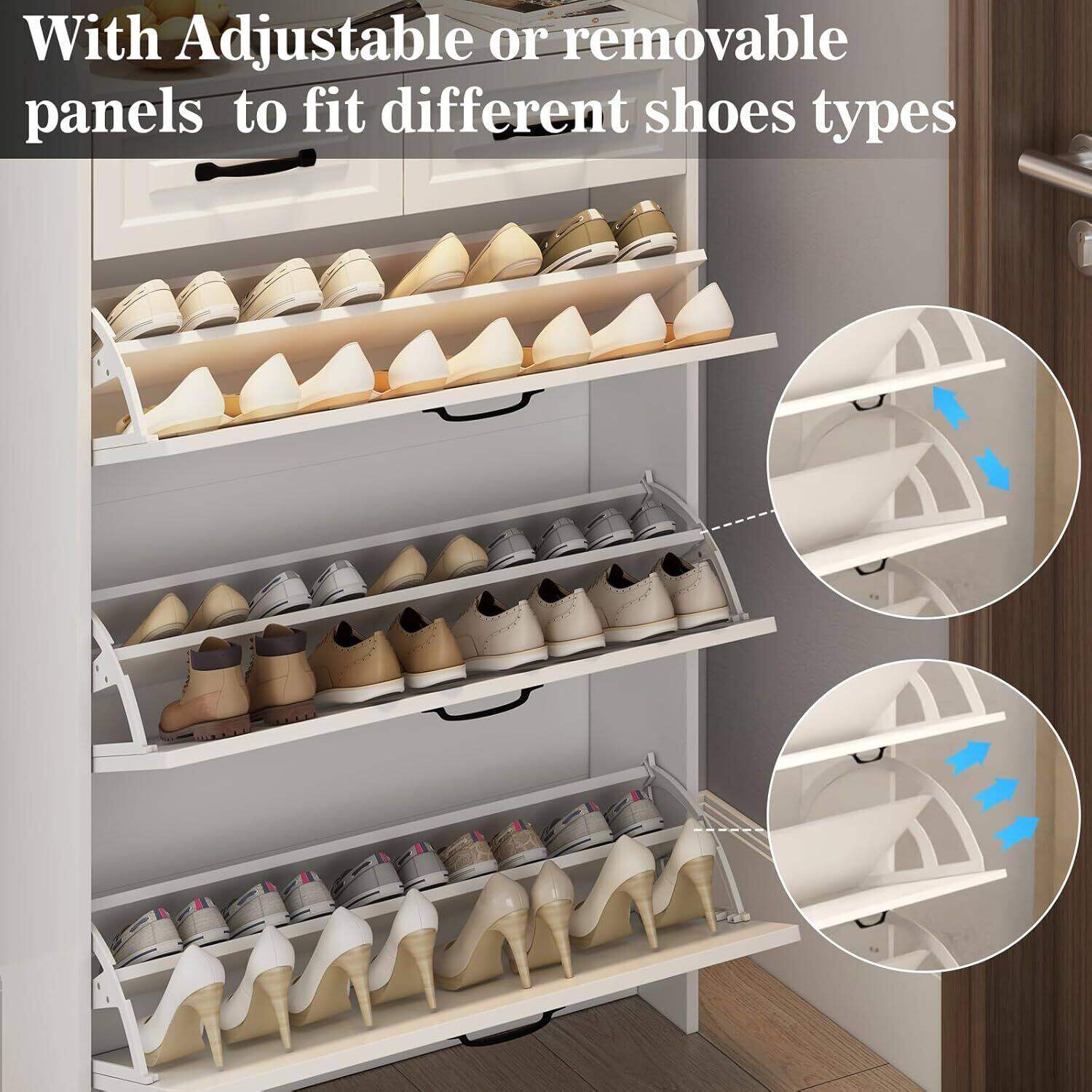 ניתן להסיר או לכוונן את המדפים במרכז כל מגירה מתקפלת כדי להתאים למידות נעליים שונות, כולל נעלי ספורט, מגפיים, עקבים גבוהים וכו'. המשטח העליון והמגירות המרווחים מושלמים לאביזרים, מפתחות, ארנקים וכו', מה שמקל עליכם לגשת לפריטים.